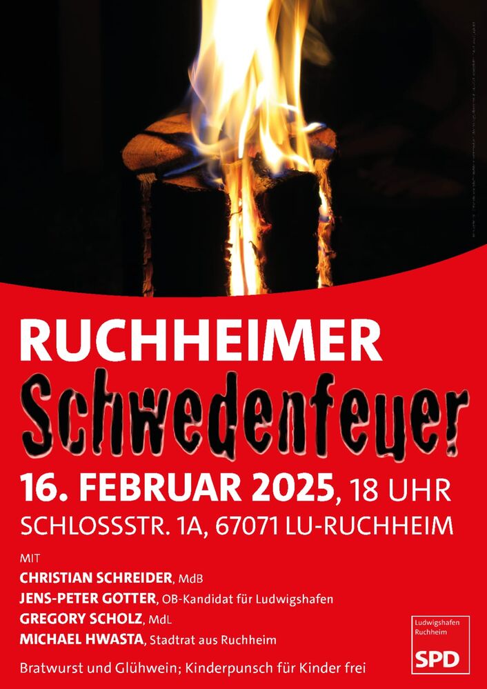 Am Sonntag, den 16. Februar 2025, von 18:00 bis 21:00 Uhr, lädt der SPD-Ortsverein zum „Ruchheimer Schwedenfeuer“ auf dem Schlossplatz vor dem Gemeinschaftshaus ein. Für das leibliche Wohl mit moderaten Preisen ist bestens gesorgt. Für Kinder gibt es Kinderpunsch kostenfrei. Christian Schreider, MdB, und OB-Kandidat Jens-Peter Gotter freuen sich auf interessante Gespräche mit den Bürgerinnen und Bürgern. Mit dabei sind auch Ruchheimer Stadtrat Michael Hwasta und Gregory Scholz, MdL, sowie viele andere Gesprächspartner*innen der Kommunalpolitik, und stehen den Besucherinnen und Besucher für Fragen und Anregungen gerne zur Verfügung.